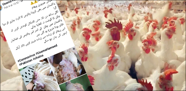 فیس بک صارف نے لکھا کہ ’پاکستان میں وائرس کی نشانیاں ظاہر ہونا شروع ہوگئیں، اگلے 60 روز تک حتیٰ الامکان مرغی کا گوشت کھانے سے گریز کریں‘۔