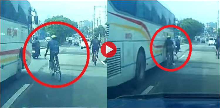 ویڈیو میں دیکھا جاسکتا ہے کہ سائیکل سوار ایک لین سے دوسری لین میں جاتے ہوئے بس کی زد میں آگیا اور بس سے ٹکرانے کے باوجود خوش قسمتی سے محفوظ رہا۔