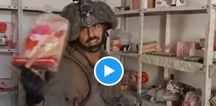 ویڈیو میں دیکھا جاسکتا ہے کہ اسرائیلی فوجی لباس میں ملبوس شخص غزہ میں فلسطینی کی دکان میں گھس کر اشیا کو پھینک رہا ہے اور ان چیزوں کو دیکھ کر ہنس رہا ہے۔