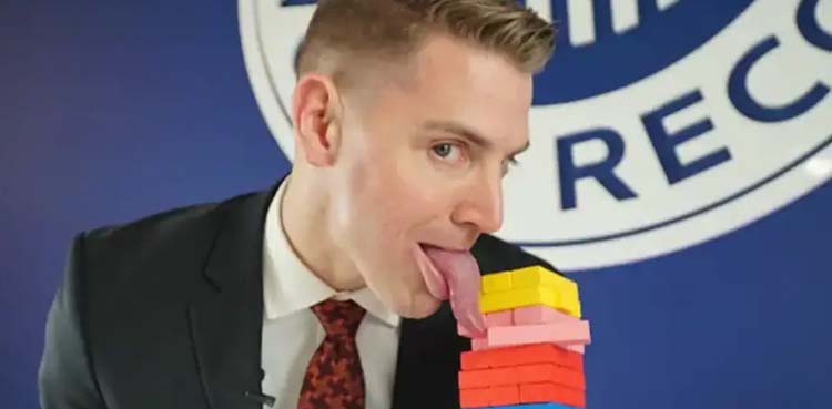 دنیا کی سب سے لمبی زبان کا گنیز ورلڈ ریکارڈ بنانے والے شخص نے تیز ترین وقت میں زبان سے پانچ بلاکس نکال کر نیا ریکارڈ قائم کردیا۔