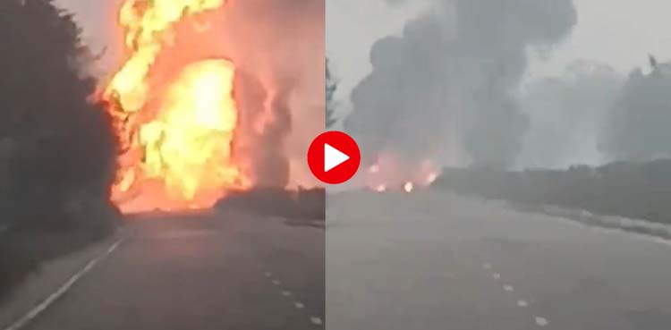 ویڈیو میں دیکھا جاسکتا ہے کہ ٹرک میں آگ بھڑکی ہوئی ہے اور دھماکے کی آواز گونج رہی ہیں۔