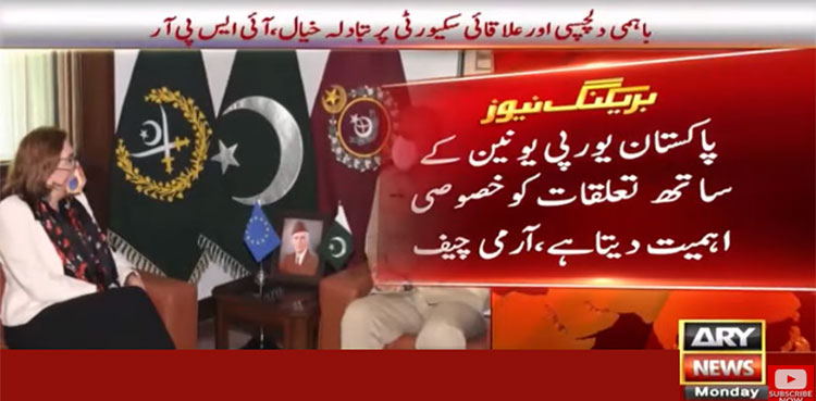 آئی ایس پی آر کے مطابق آرمی چیف قمر جاوید باجوہ سے یورپی یونین کی سفیر نے ملاقات کی جس میں باہمی دلچسپی اورعلاقائی سکیورٹی پر تبادلہ خیال کیا گیا۔