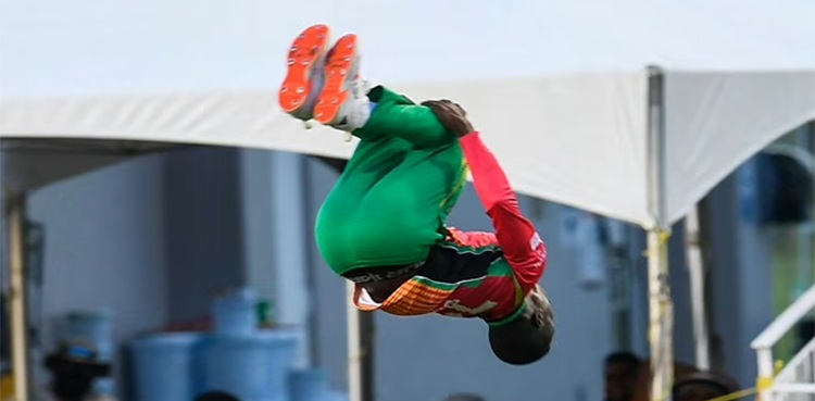 گیانا ایمزون کے بولر سنکلیئر نے مچل سینٹنر کو آؤٹ کرکے جمناسٹک کا مظاہرہ کیا۔ ہوا میں تین بار قلابازی کھائی اور وکٹ کی خوشی منائی۔