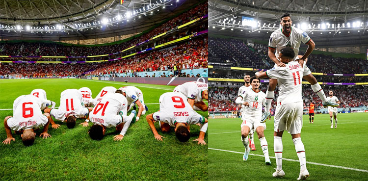 مراکش کی تاریخی کامیابی پر الثمامہ اسٹیڈیم گونج اٹھا، اس موقع پر مراکش کے کھلاڑیوں نے میدان میں سجدہ ریز ہوکر شکر خداوندی بجالایا۔