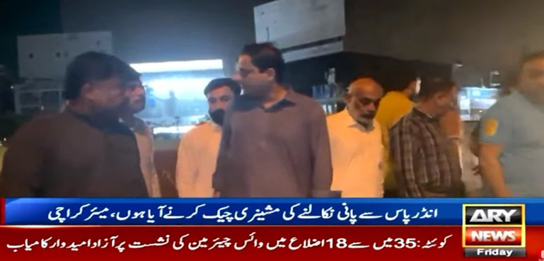 میئر کراچی بیرسٹر مرتضیٰ وہاب نے شہر کے مختلف انڈر پاسز کا دورہ کیا، انھوں نے افسران کو انڈر پاسز میں صفائی کی صورتحال کو یقینی بنانے کی ہدایت کرتے ہوئے کہا کہ بارشوں کے دوران انڈرپاسز میں پانی جمع نہ ہونے پائے۔
