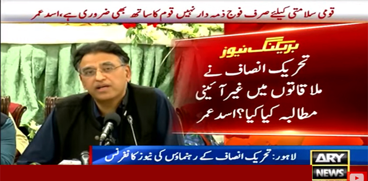 تحریک انصاف کے مرکزی رہنما اسدعمر نے کہا ہے کہ تحریک انصاف نے ملاقاتوں میں کون سا غیرآئینی مطالبہ کیا؟ سب جانتے ہیں کہ صرف ایک مطالبہ تھا الیکشن کا۔
