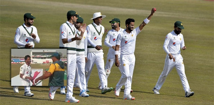 لنچ بریک کے بعد نئی گیند ملتے ہی حسن علی اور شاہین شاہ آفریدی نے شاندار بولنگ کرتے ہوئے بازی پلٹ دی۔ نئی گیند کے ساتھ 15 اوورز میں ہی 7 وکٹیں حاصل کر کے ٹیم کو فتح دلوا دی۔