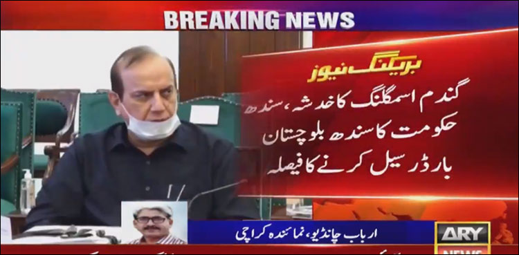 اے آر وائی نیوز کے نمائندے ارباب چانڈیو کے مطابق گندم اسمگلنگ کے خدشے کے پیش نظر سندھ حکومت نے سندھ بلوچستان بارڈرسیل کرنےکافیصلہ کرلیا ،سندھ کابینہ نےفوڈایکٹ کے تحت بارڈرسیل کرنےکی ہدایت کردی ہے۔
