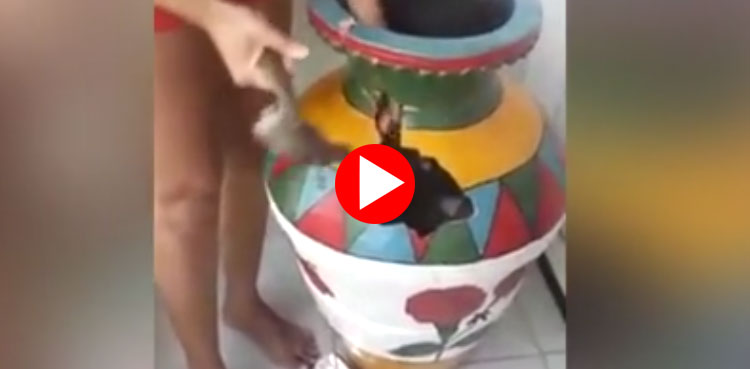 غیرملکی خبررساں ادارے کی رپورٹ کے مطابق یہ واقعہ برازیل کے علاقے ایمازوناس میں پیش آیا جہاں 6 سالہ بچہ کھیل کھیل میں صراحی کی طرح نظر آنے والے مٹی کے بڑے مٹکے میں پھنس گیا، ماں نے ہتھوڑی سے صراحی توڑ کر بچے کو باحفاظت باہر نکالا اس دوران گھر کے لوگوں نے قہقہے بھی لگائے۔