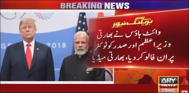 بھارتی میڈیا رپورٹ کے مطابق وائٹ ہاؤس نے بھارتی وزیراعظم نریندر مودی اور صدر کو ٹویٹر پر ان فالو کردیا، وائٹ ہاؤس نے نریندر مودی کے دفتر کے ٹویٹر ہینڈل کو بھی ان فالو کردیا۔