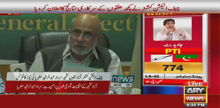 پریس کانفرنس کرتے ہوئے انہوں نے اعلان کیا کہ ایل اے 43کشمیر ویلی 4 سے پی ٹی آئی کے جاوید بٹ کامیاب ہوئے۔ پی ٹی آئی کے جاویدبٹ نے 482 ووٹ لیے جب کہ مسلم لیگ ن کی امیدوار نے 420 ووٹ لیے۔