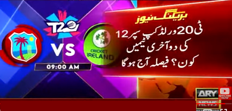 اے آر وائی نیوز کے مطابق آج پہلا میچ ویسٹ انڈیز اور آئرلینڈ کے مابین اور دوسرا میچ زمبابوے اور اسکاٹ لینڈ کی ٹیموں کے مابین کھیلا جائیگا، ان میچوں کی فاتح ٹیمیں سپر 12 مرحلے کے لیے کوالیفائی کرلیں گی۔