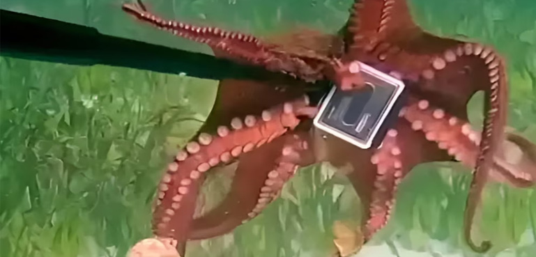 انھوں نے آکٹوپس سے ایک اسٹک کی مدد سے بڑی مشکلوں سے کیمرہ لیا، اس دوران انھوں نے آکٹوپس کی فلم بھی بنائی، جو سوشل میڈیا پر وائرل ہورہی ہے.