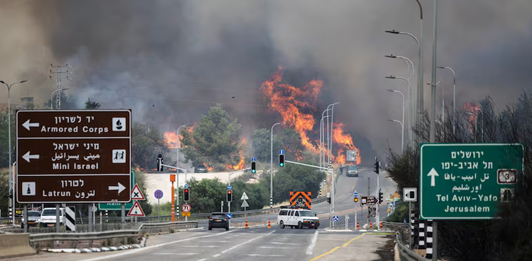 آن لائن گردش کرنے والی ویڈیو فوٹیج میں دکھایا گیا ہے کہ یروشلم کی ایک بڑی سڑک کے قریب آگ کے شعلے بھڑک رہے ہیں، آگ پر قابو پانے کے لیے طیارے منگوائے گئے ہیں۔