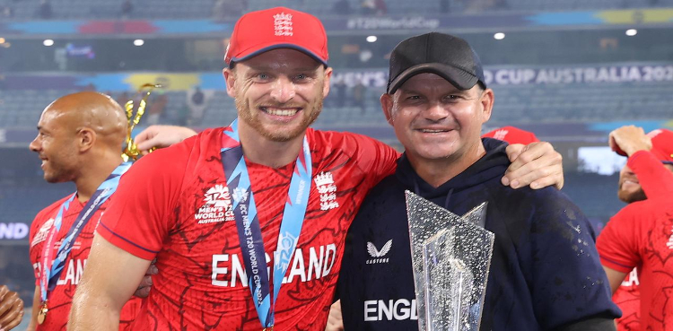 ٹی ٹوئنٹی ورلڈکپ کی چیمپئن انگلینڈ کی ٹیم نے ٹرافی جیتنے کے بعد ہوٹل کے ڈریسنگ روم پہنچ کر اپنے کوچ کو گنجا کردیا۔