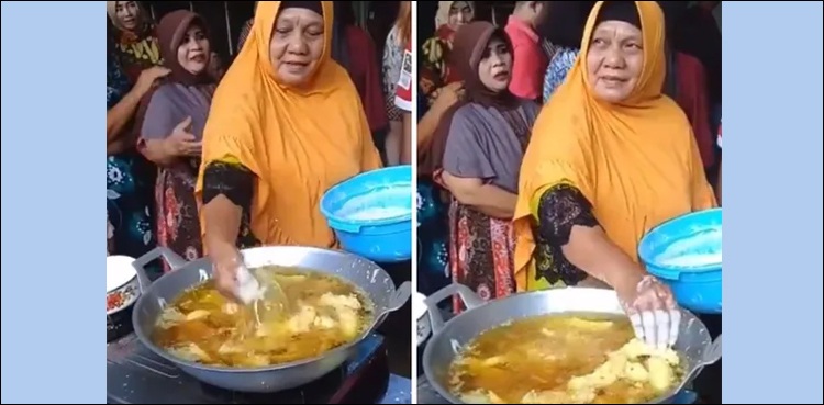 ویڈیو میں ایک خاتون دکھائی دیتی ہیں جو ایک برتن میں کھولتے ہوئے گرم تیل میں کوئی کھانا تل رہی ہیں، لوگ اس خاتون کا کھانا بے حد شوق سے کھاتے ہیں ور اس کی وجہ صرف ذائقہ نہیں بلکہ ان کا یہ حیرت انگیز عمل بھی ہے جسے دیکھ کر لوگ سوچنے پر مجبور ہوتے ہیں کہ آخر خاتون یہ کیسے کر لیتی ہیں۔