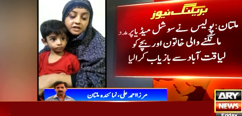 ملتان پولیس نے سوشل میڈیا پر مدد مانگنے والی خاتون اور اس کے بچے کو لیاقت آباد سے بازیاب کرا لیا ہے۔