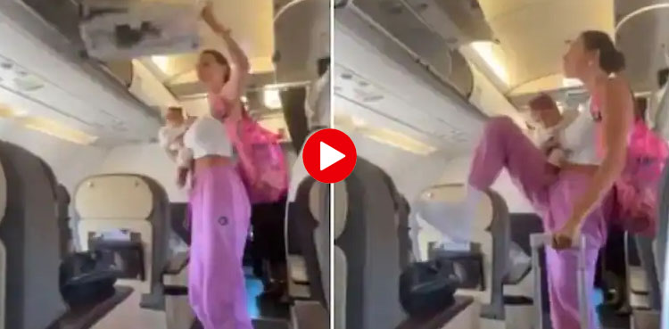 ویڈیو میں دیکھا جاسکتا ہے خاتون شیر خوار بچے کو تھامے ہوئی ہے اور طیارے سے پہلے ہینڈ کیری نکالتی ہیں اور پھر انہیں اوور ہیڈ بین بند کرنا ہوتا ہے تو وہ ہاتھ کی بجائے پاؤں کو اپنے سر سے اونچا لے کر اسے بند کردیتی ہیں۔