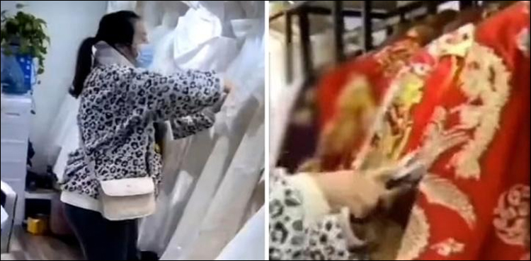 خاتون جیسے ہی چین کے روایتی سنہرے اور سرخ رنگ کا عروسی گاؤن کی طرف بڑھی، ویڈیو بنانے والے نے متنبہ کیا کہ یہ گاؤن انتہائی قیمتی ہے (تقریباْ 10 ہزار یوان پاکستانی ایک لاکھ 10 ہزار روپے) لیکن خاتون نے تنبیہہ کو نظرانداز کرتے ہوئے ان لباسوں کو بھی اپنے غصے کا نشانہ بناڈالا۔