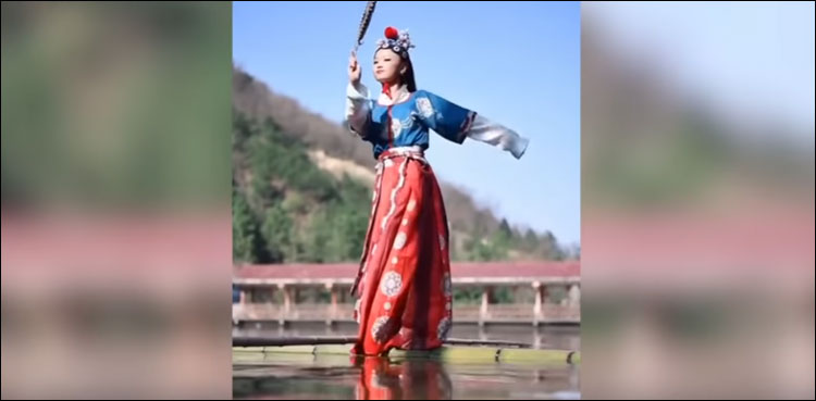 بیجنگ : چینی حسینہ نے بانس پر سوار ہوکر رقص کرتے ہوئے دریا عبور کرکے دنیا کو حیران کردیا۔
