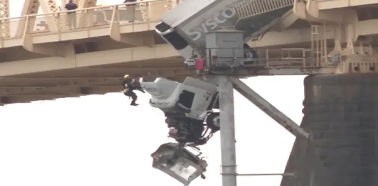 امریکہ میں دریائے اوہائیو کے پل پر ایک ٹرک حادثے کا شکار ہوا جس کے باعث وہ حفاظتی ریلنگ کو توڑتا ہوا نیچ لٹک گیا جبکہ خاتون ٹرک ڈرائیور بھی اس میں موجود اور ہوا میں معلق تھیں۔ انٹرنیٹ پر اس ڈرامائی منظر کی ویڈیو تیزی سے وائرل ہوگئی۔