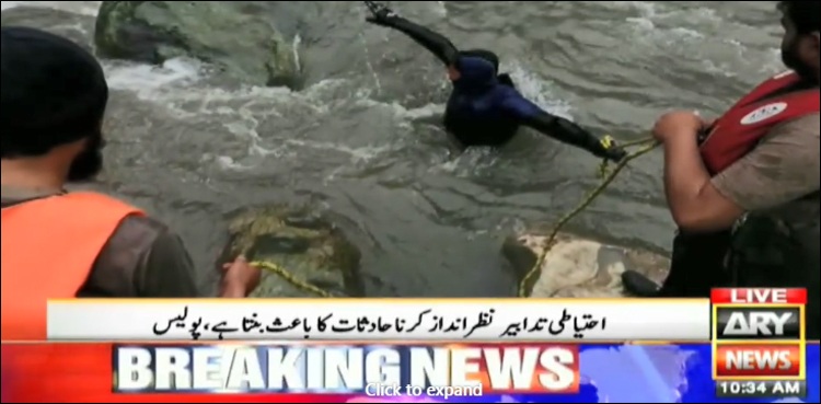 واقعے کے بعد ریسکیو اداروں نے غوطہ خوروں کی مدد سے خاتون کی لاش کو تلاش کرنے کا کام شروع کیا مگر انہیں ناکامی کا سامنا رہا۔ حادثے میں مرنے والی خاتون کی شناخت 32 سالہ صائمہ کے نام سے ہوئی ہے۔