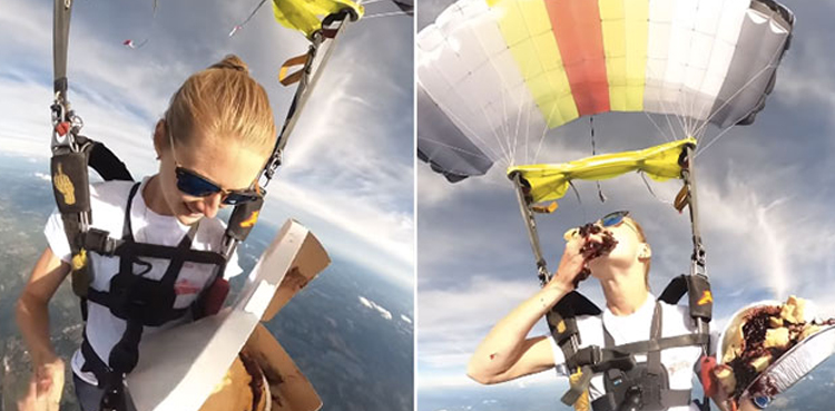 عام طور پر اسکائی ڈائیونگ کے دوران لوگوں کو ہر وقت گرنے کا خوف لگا رہتا ہے لیکن ایک خاتون نے اس موقع پر بھی کیک سے لطف اندوز ہونا چاہا۔