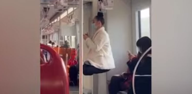 یوٹیوب پر اپ لوڈ کی گئی ایک ویڈیو میں دیکھا جا سکتا ہے کہ موبائل فون میں مگن خاتون بالوں کے سہارے ہینڈریل میں لٹکی مزے سے سفر کر رہی ہیں۔ خاتون کو دیکھ کر ایسا معلوم ہوتا ہے کہ جسے وہ زمین پر بیٹھی ہوں۔