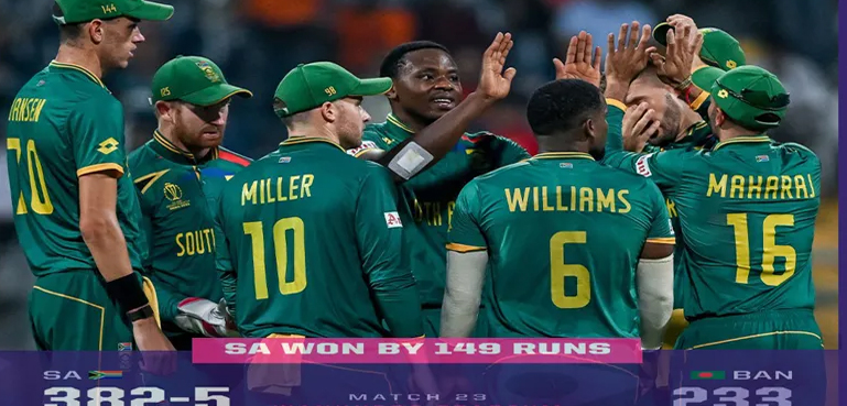 جنوبی افریقہ نے بنگلہ دیش کے خلاف 382 رنز کا ہدف کھڑا کرنے کے بعد بنگال ٹائیگرز کو 233 رنز پر قابو کرکے 149 رنز سے جیت اپنے نام کی جو اس میگا ایونٹ میں اس کی دفاعی چیمپئن 229 رنز کی شاندار فتح کے بعد رنز کے حساب سے دوسری بڑی جیت ہے جب کہ اسی ٹورنامنٹ میں نیوزی لینڈ افغانستان کو بھی 149 رنز سے ہرا چکا ہے۔