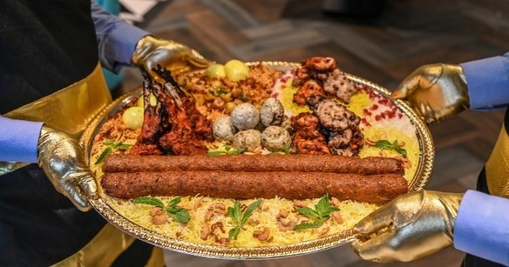ایک تھال میں بریانی کو کچھ اس طرح پیش کیا جاتا ہے جس میں زعفرانی چاول، کشمیری سیخ کباب، راجپوت چکن کباب، ملائی کوفتہ، ملائی چکن روسٹ اور دنبے کی چانپیں شامل ہیں۔