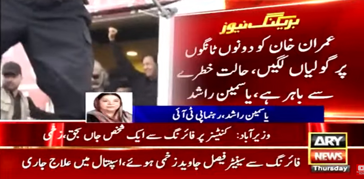 پاکستا تحریک انصاف کے راہنما اور سابق وزیر صحت پنجاب یاسمین راشد کا کہنا ہے کہ پارٹی چیئرمین عمران خان کو دونوں ٹانگوں میں گولیاں لگی ہیں۔