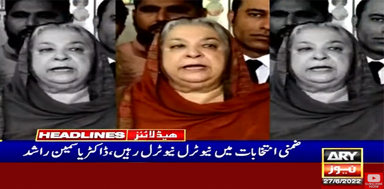 تحریک انصاف پنجاب کی صدر ڈاکٹر یاسمین راشد نے کہا ہے کہ آئی جی پنجاب نے یقین دلایاکہ ہم نیوٹرل رہیں گے حکومتی اداروں کا نیوٹرل رہنا بہت ضروری ہے ضمنی انتخاب میں نیوٹرل نیوٹرل ہی رہیں۔