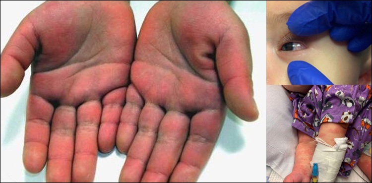 علاوہ ازیں متاثرہ بچے کی جلد خراب ہوتی، آنکھیں سرخ اور گردن کے گرد سوجن و غدود ہوجاتے ہیں، ساتھ ہی اس کے ہونٹ خشک ، انگلیاں اور ہتھیلی بھی سرخ ہوجاتی ہے۔