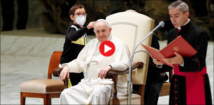 مذہبی تقریب کے دوران کمسن بچہ پوپ فرانسس کی ٹوپی لے کر بھاگنے کی کوشش کرتا رہا جس کی ویڈیو سوشل میڈیا پر وائرل ہوگئی۔
