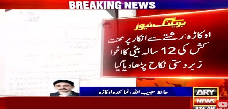 اے آر وائی نیوز کے مطابق اوکاڑہ کے علاقے موضع اکبر میں رشتے سے انکار پر محنت کش کی 12 سالہ بیٹی کو اغوا کرکے اس کا زبردستی نکاح پڑھا دیا گیا ہے، پولیس نے بچی کے والد کی مدعیت میں مقدمہ درج کرلیا ہے۔
