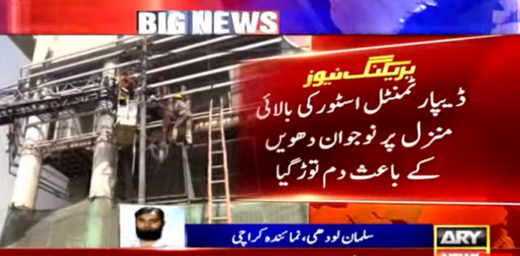 تفصیلات کے مطابق کراچی کے علاقے جیل چورنگی کے قریب ڈیپارٹمنٹل اسٹور میں آگ لگنے کے واقعے میں اسٹور کی بالائی منزل پر پھنسا نوجوان دھویں کے باعث دم توڑ گیا۔