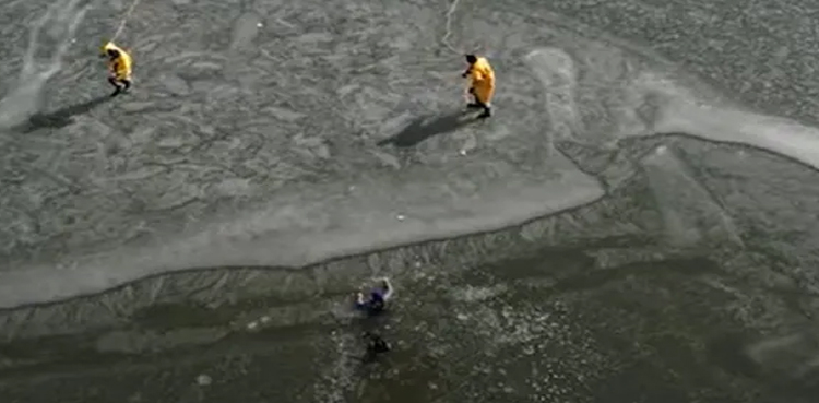 ویڈیو میں دیکھا جاسکتا ہے کہ ایک ریسکیو کارکن جمی ہوئی جھیل کے ٹوٹے ہوئے اس حصے کی جانب بڑھ رہا ہے جہاں نوجوان ڈوبا تھا اور اسے رسی کے ذریعے باہر نکال کر محفوظ مقام پر منتقل کیا جاتا ہے۔