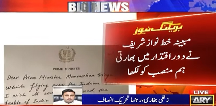 پی ٹی آئی رہنما زلفی بخاری نے سابق وزیراعظم نواز شریف کا خط ٹویٹر پر پوسٹ کردیا، مبینہ خط نواز شریف نے دور اقتدار میں بھارت کی فضائی حدود کے استعمال کے دوران بھارتی ہم منصب من موہن سنگھ کو لکھا، جس میں بھارتی فضائی حدود کے استعمال پر بھاری حکومت اور عوام کیلئے نیک تمناوں کا اظہار کیا گیا۔